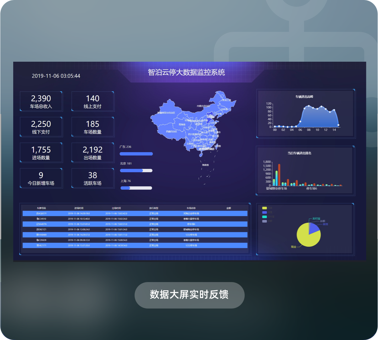 丰富的大数据可视化展示平台、强大的可视化编辑后台,让用户根据自己需要编辑自己想要的大数据展示平台,企业运营人员可以根据实时大数据分析平台对各个车场运营财务状况以及车辆进出情况了如指掌,帮助运营人员更好的做决策。